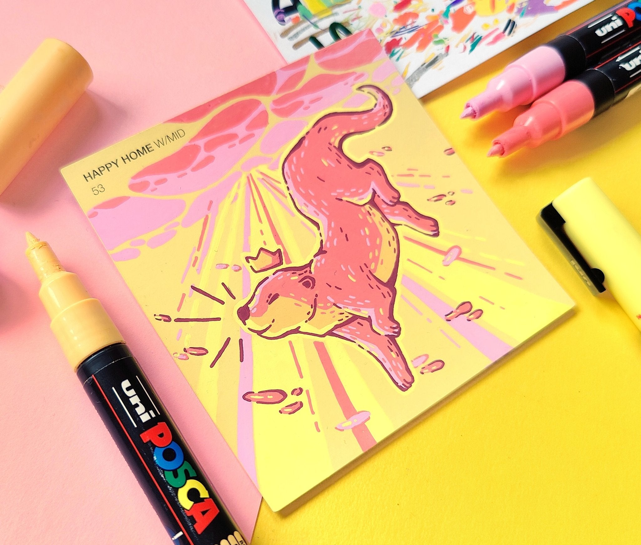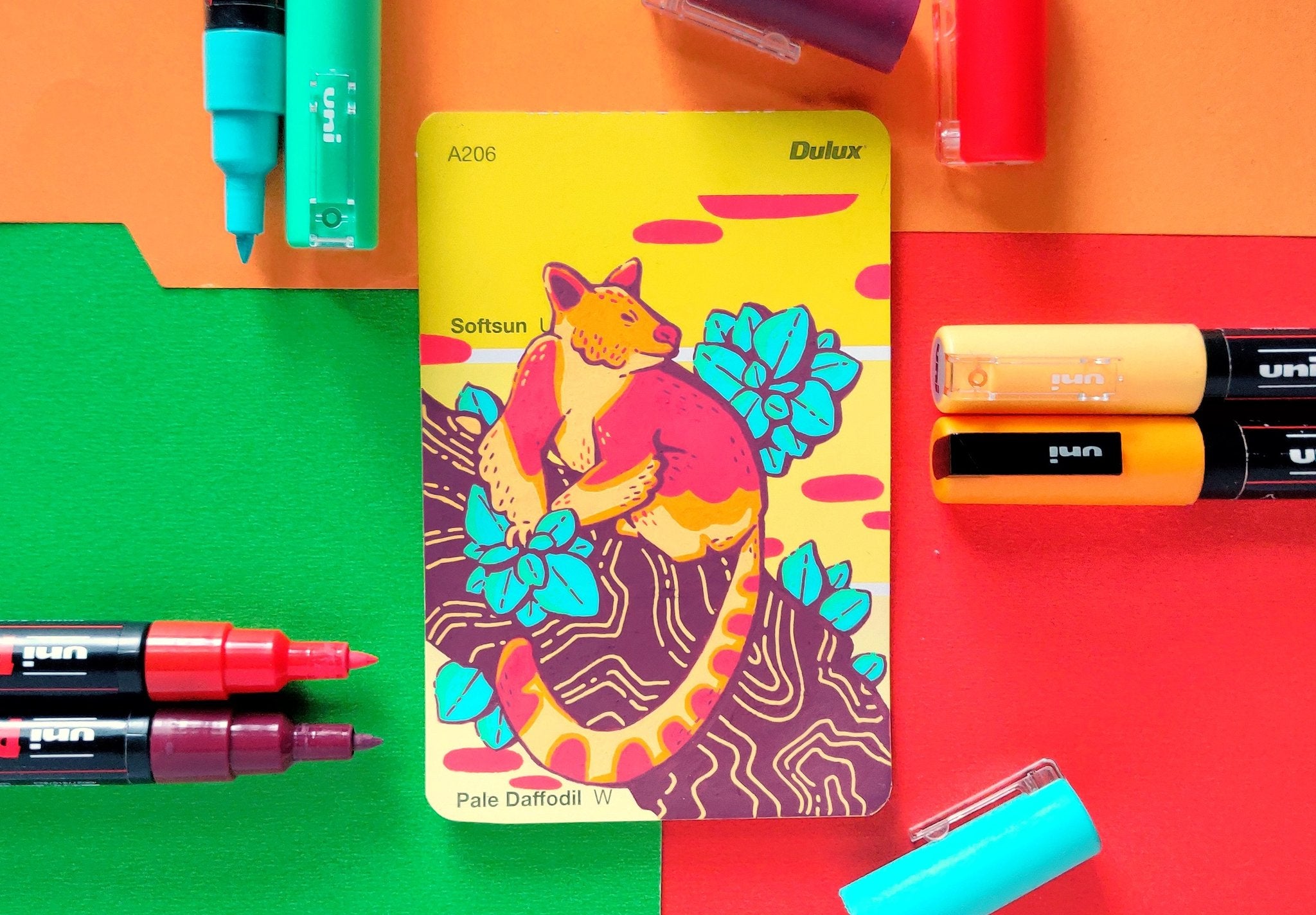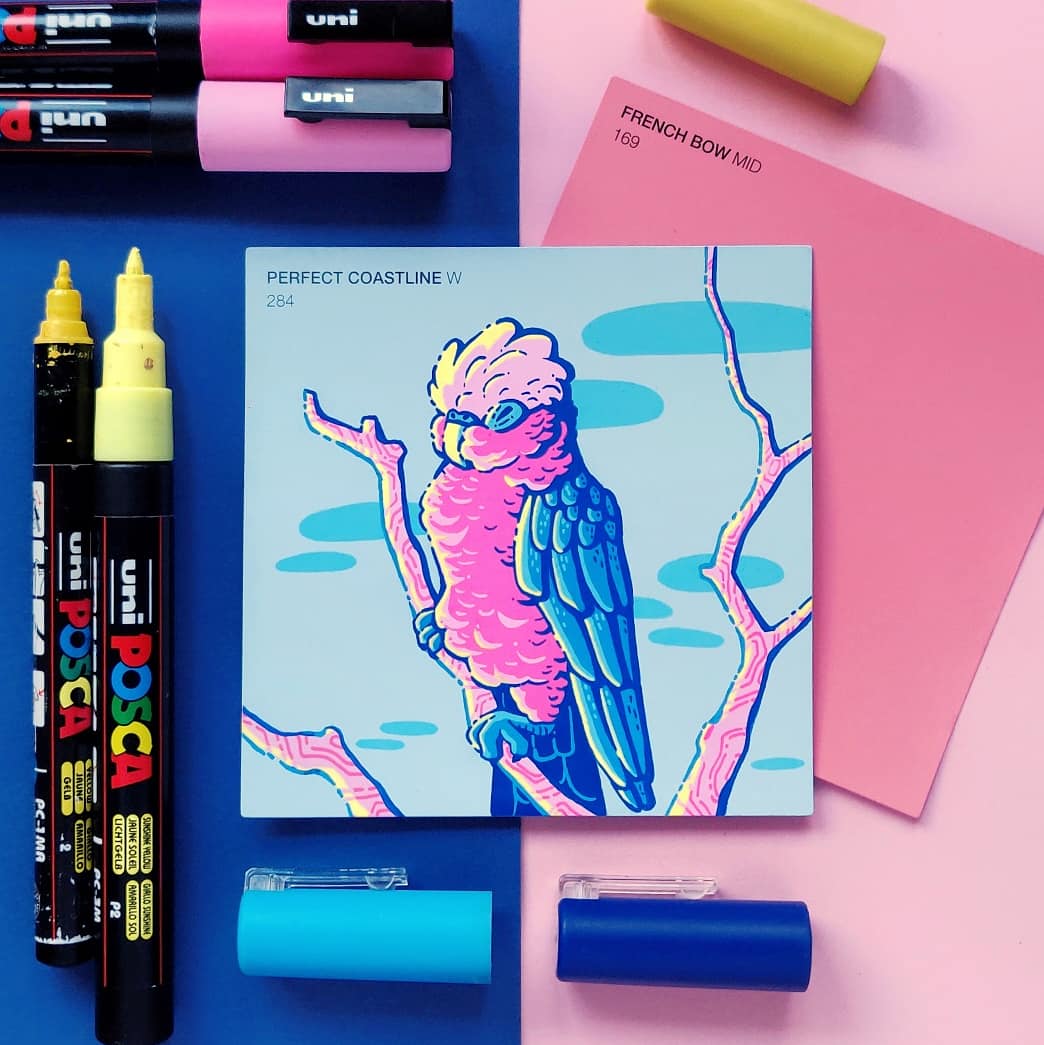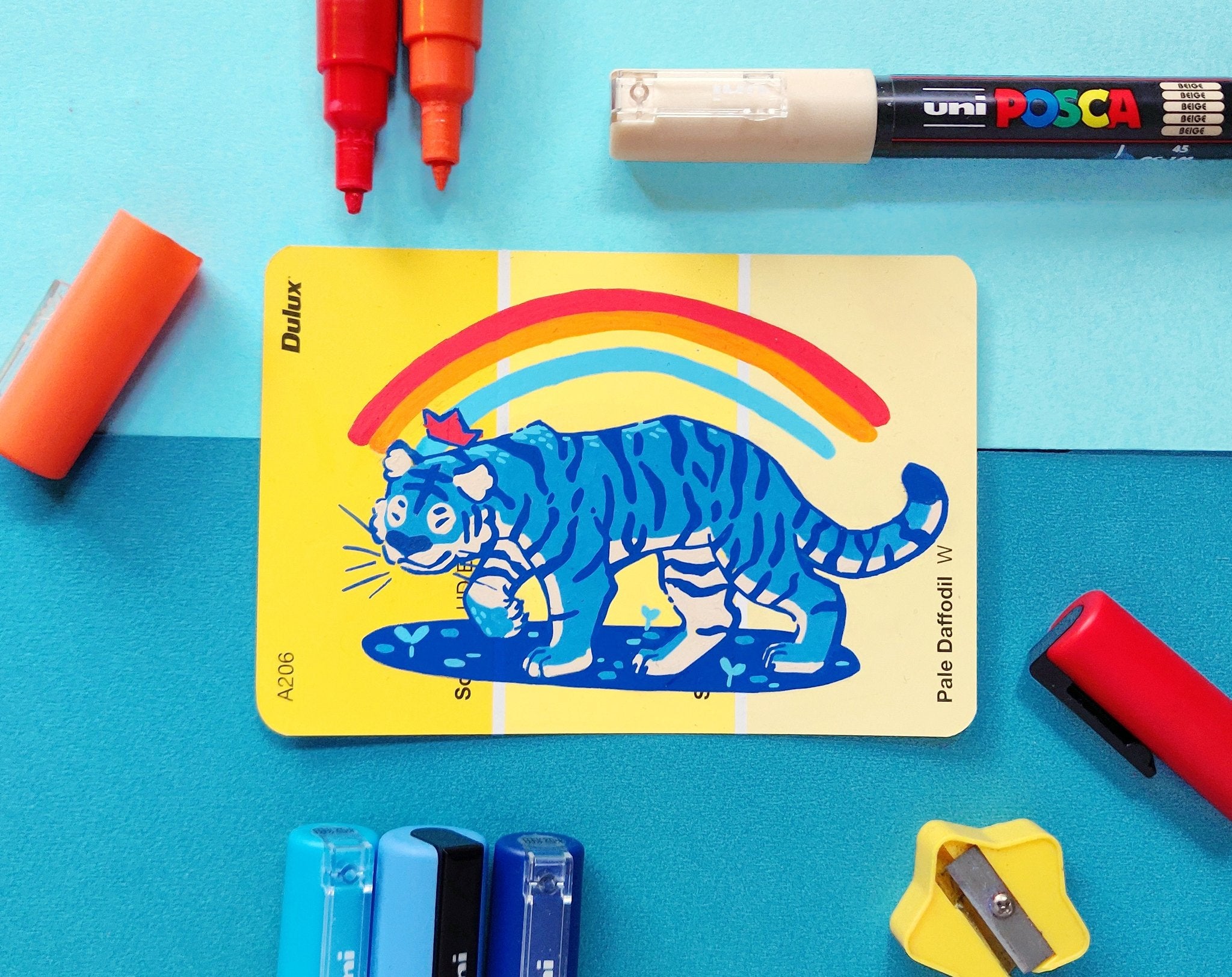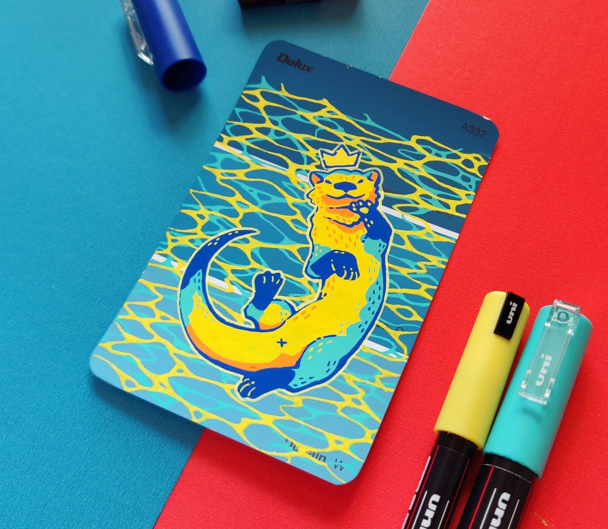In an effort to find an affordable and eye-catching canvas, I began experimenting with paint pens on paint swatch cards. Due to the pre-determined main colour and small size, it gave me some really interesting parameters to creatively wrestle with.