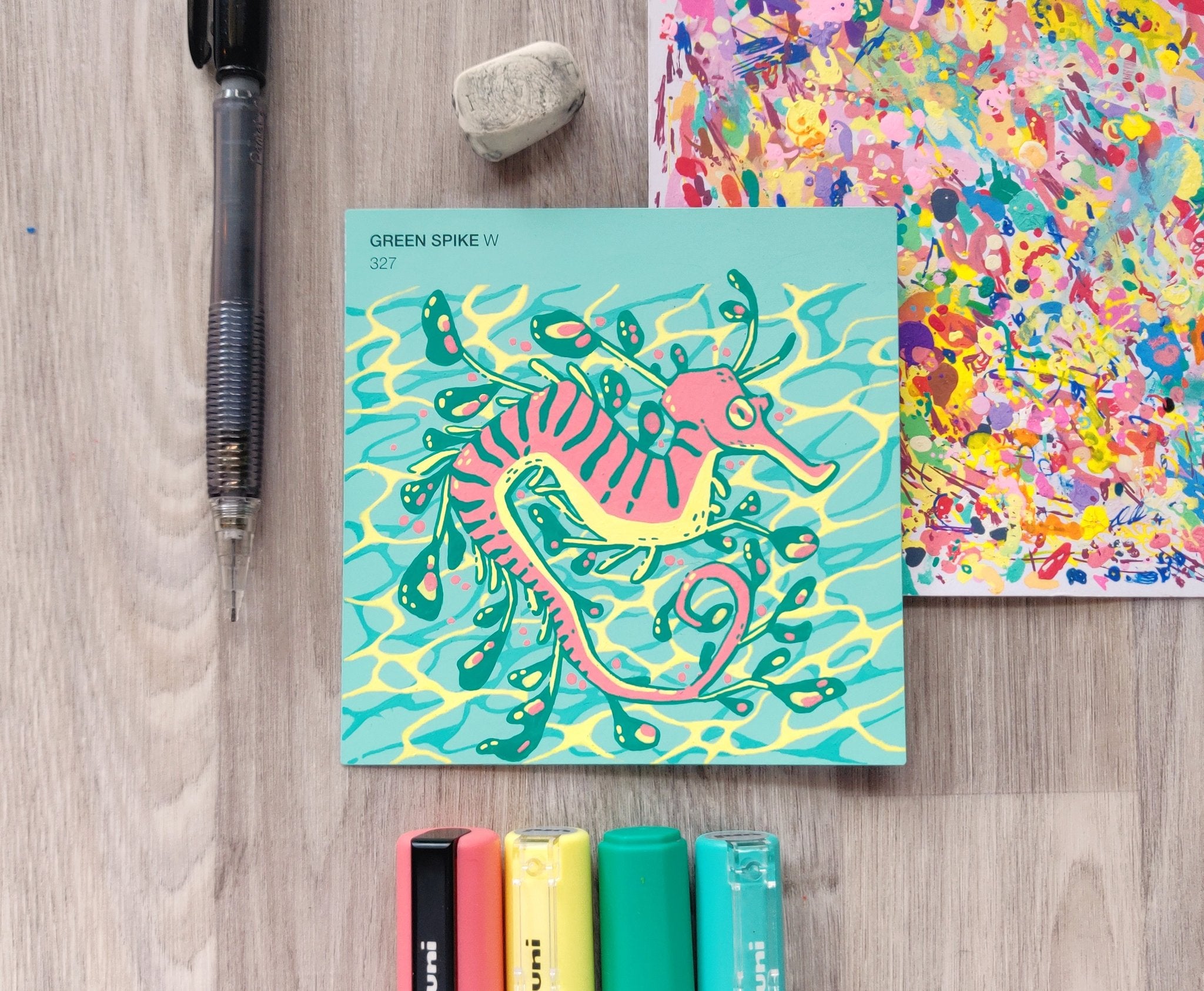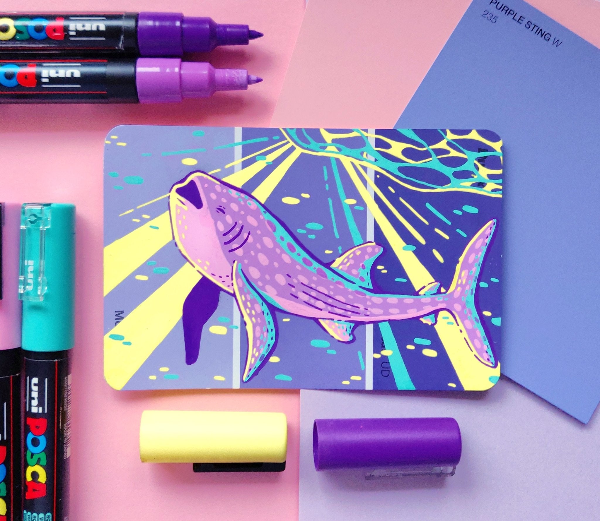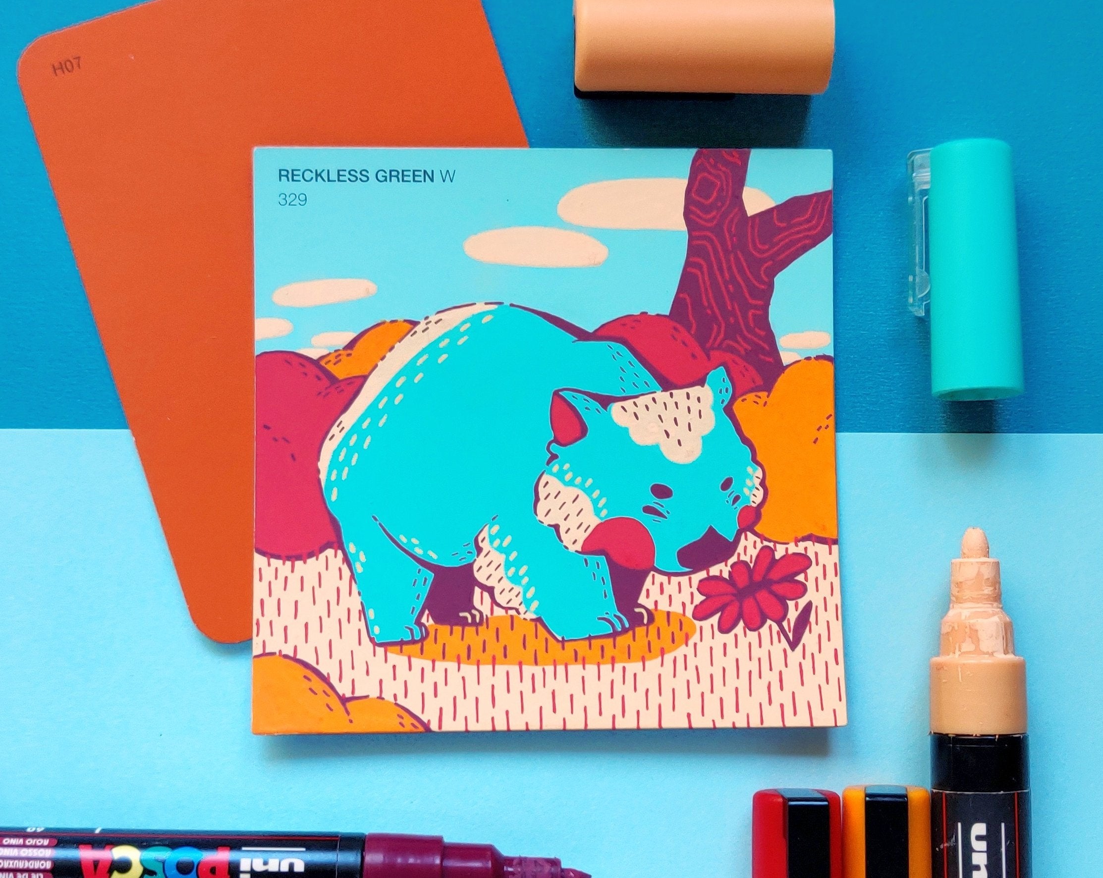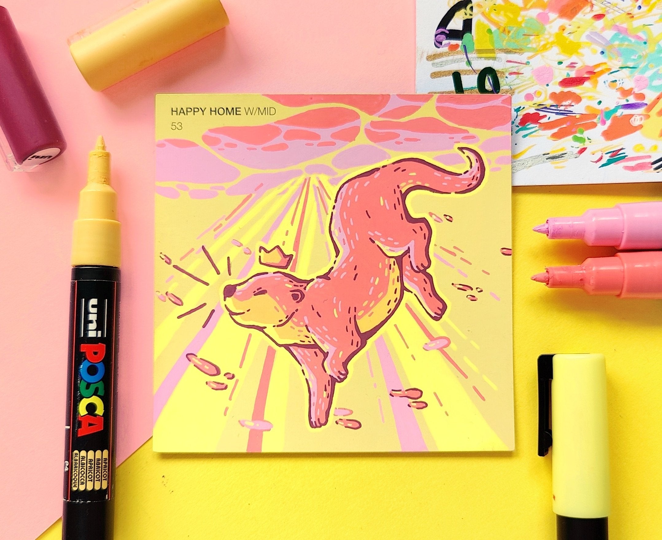 In an effort to find an affordable and eye-catching canvas, I began experimenting with paint pens on paint swatch cards. Due to the pre-determined main colour and small size, it gave me some really interesting parameters to creatively wrestle with.