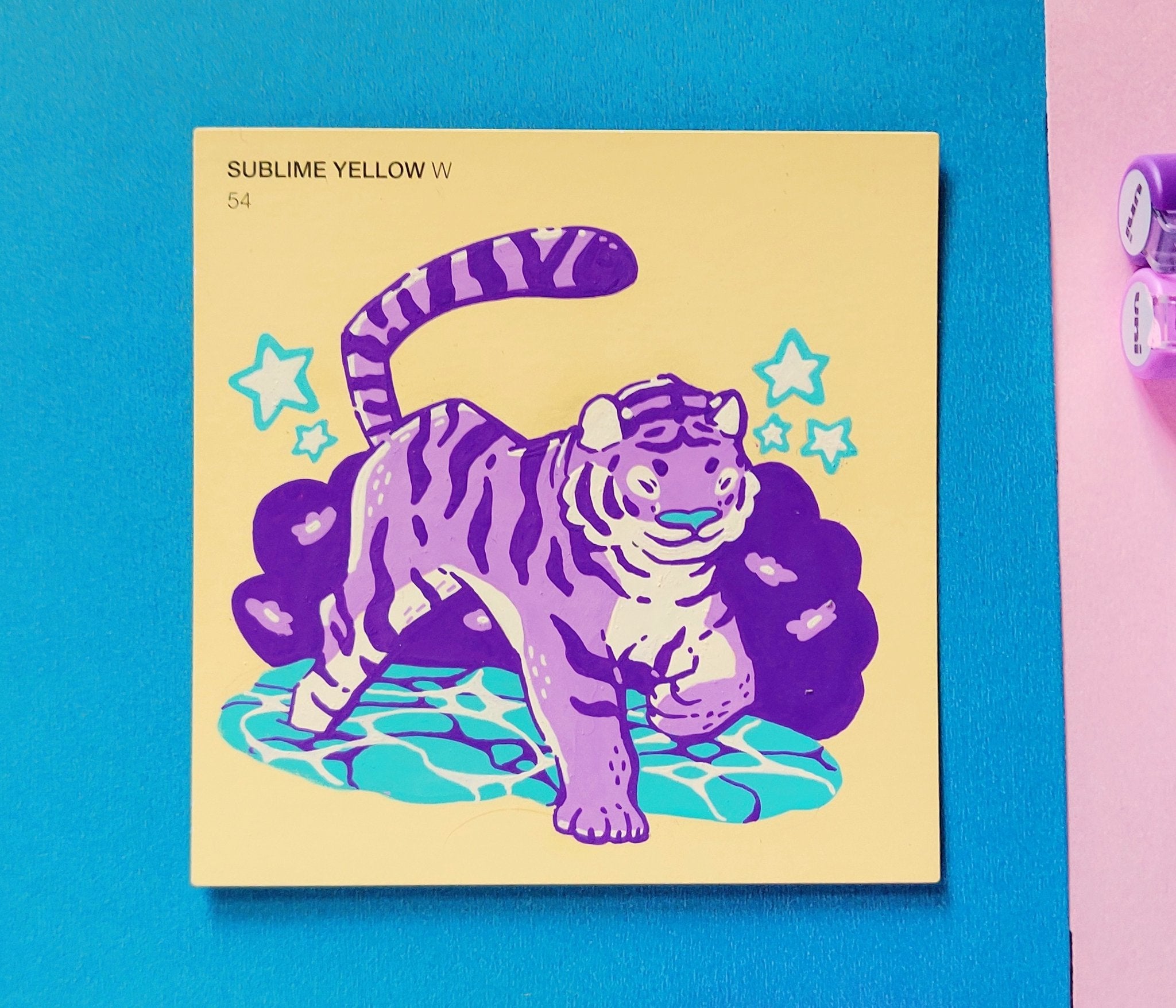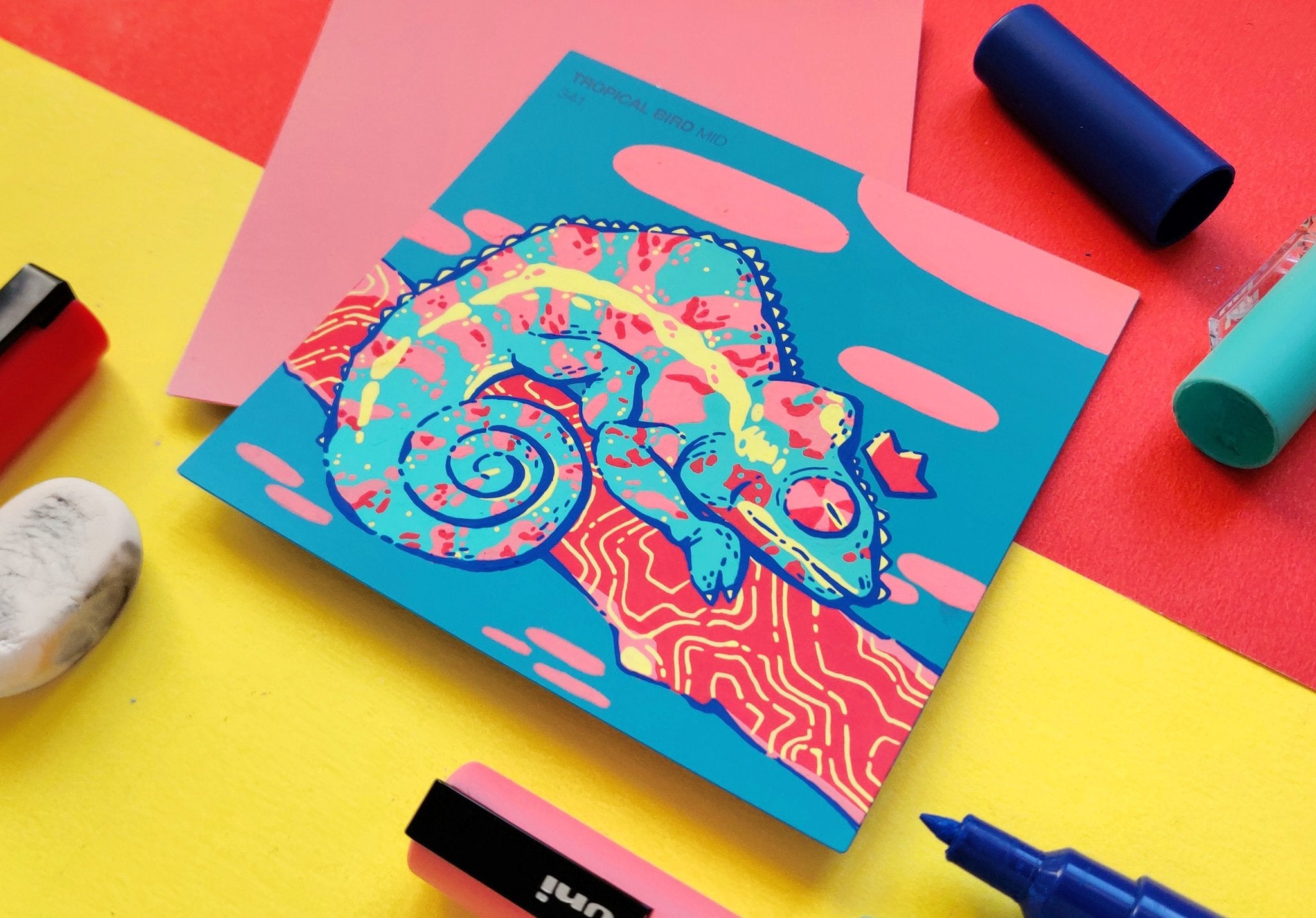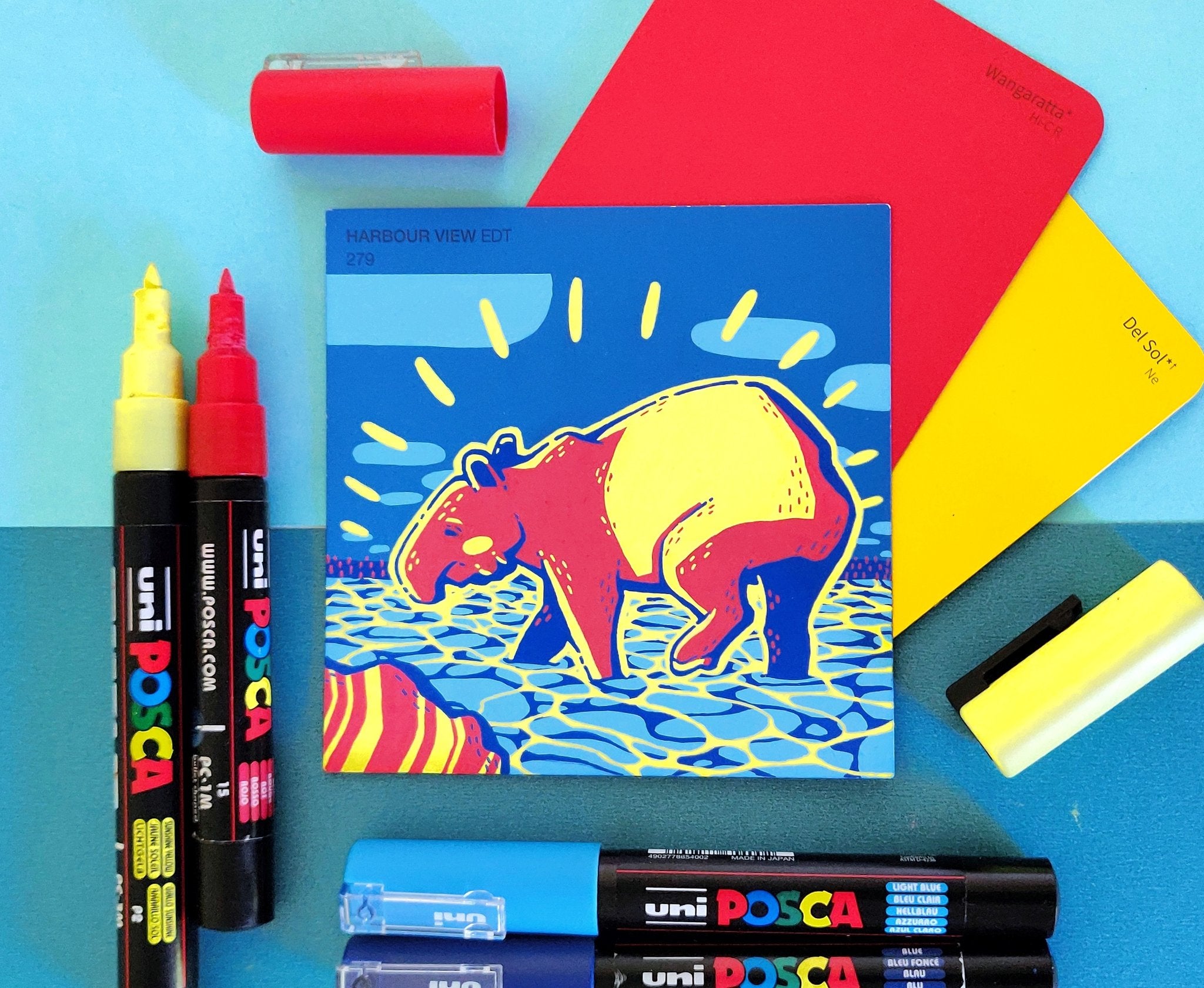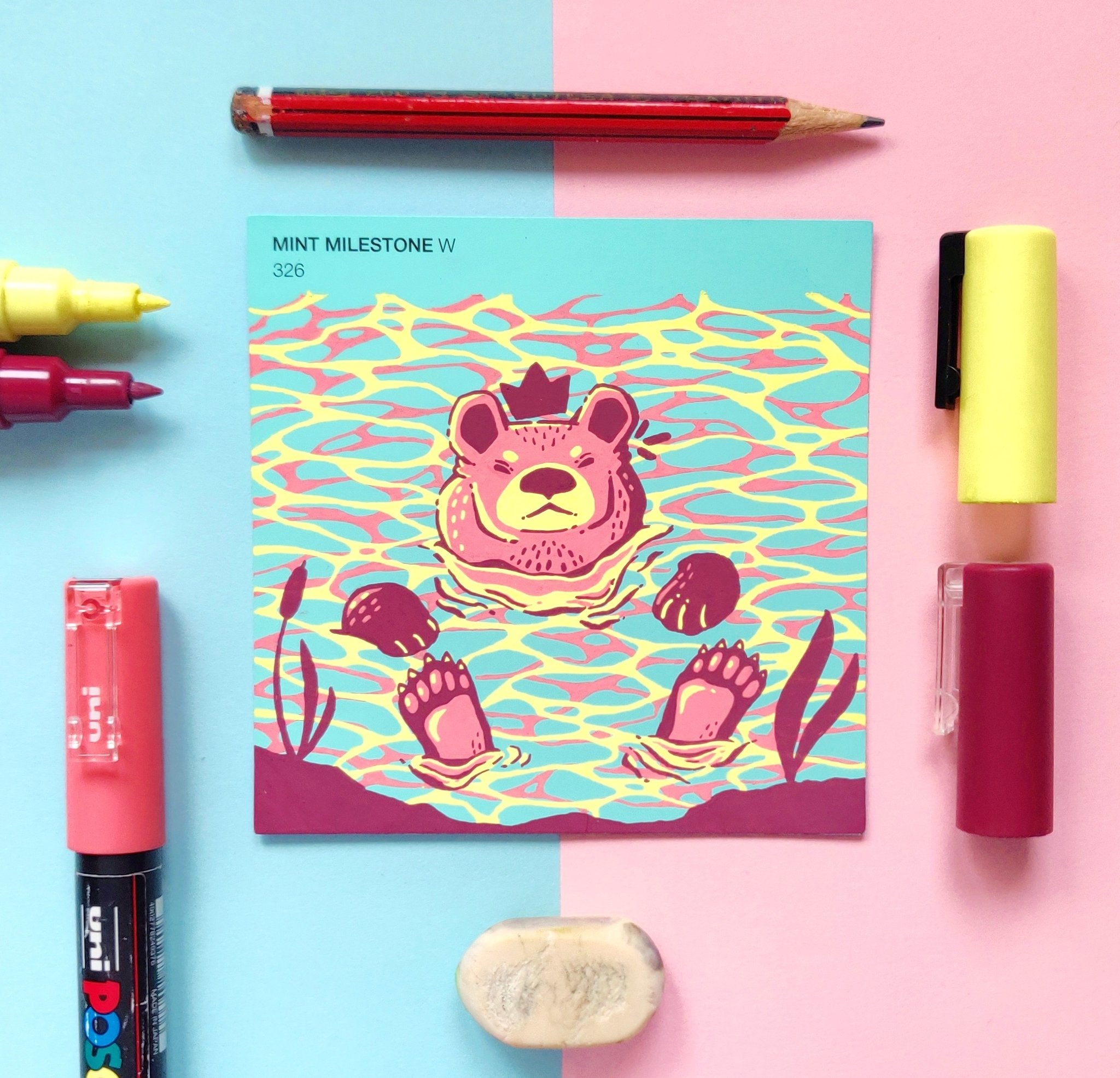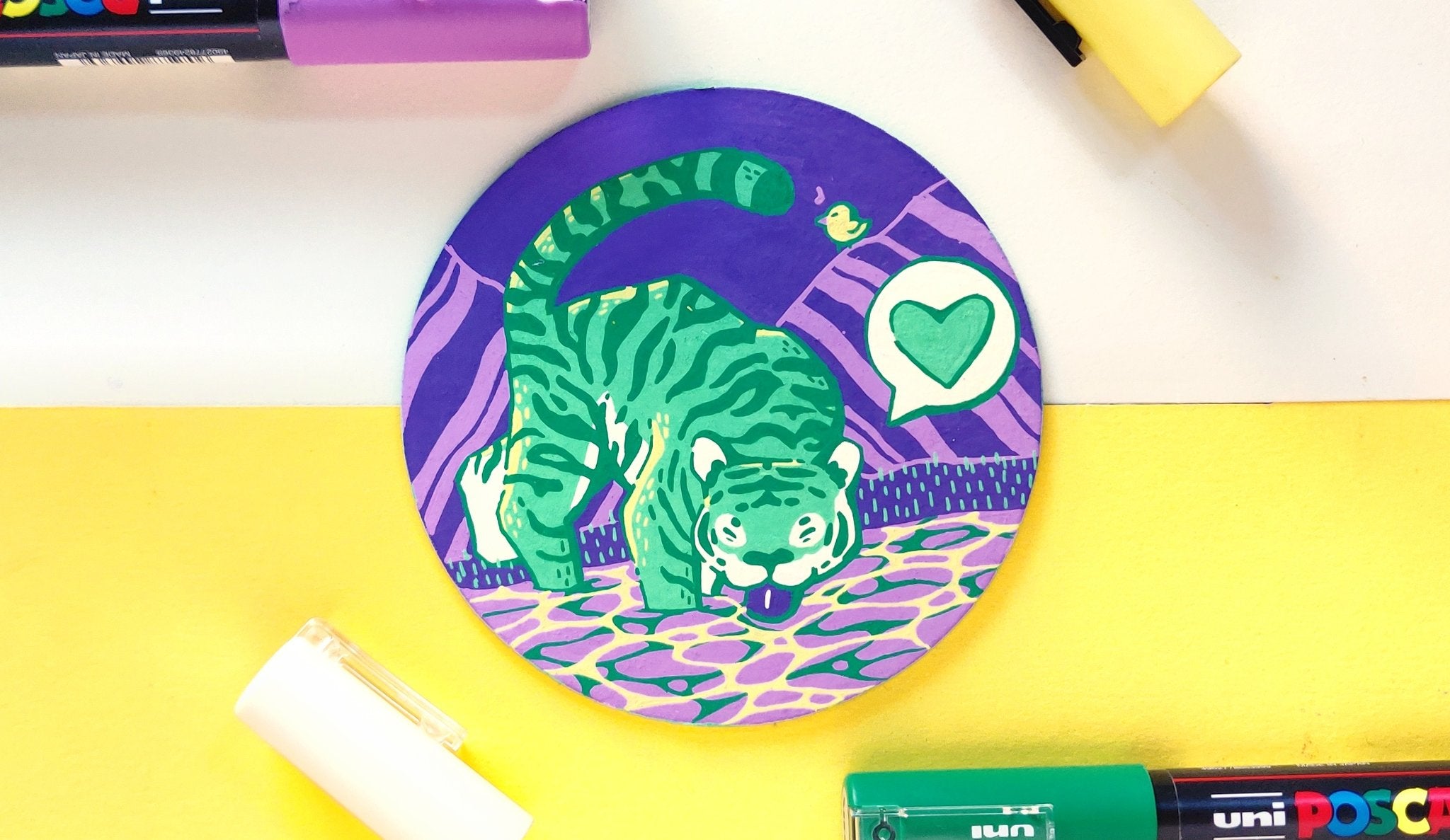 In an effort to find an affordable and eye-catching canvas, I began experimenting with paint pens on paint swatch cards. Due to the pre-determined main colour and small size, it gave me some really interesting parameters to creatively wrestle with.