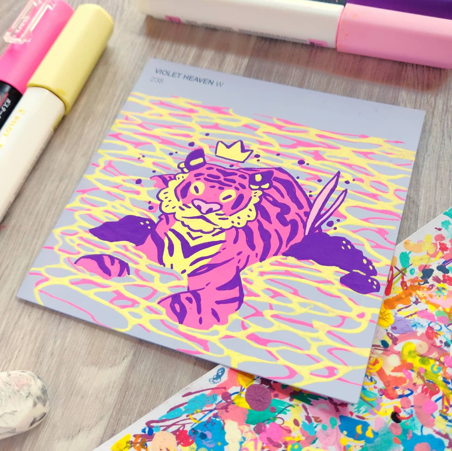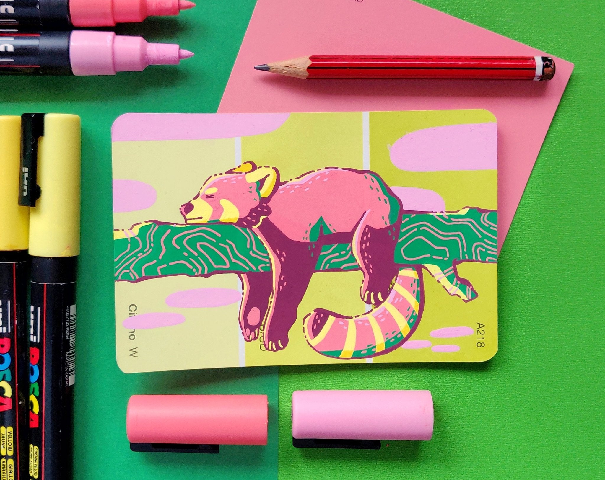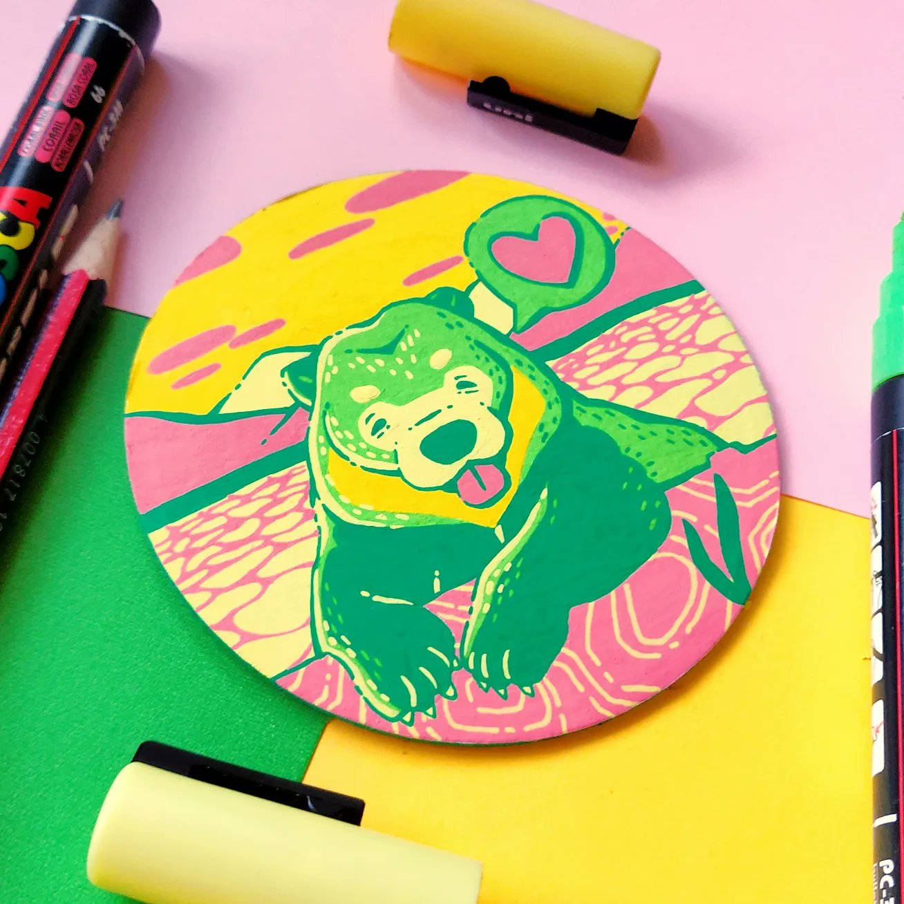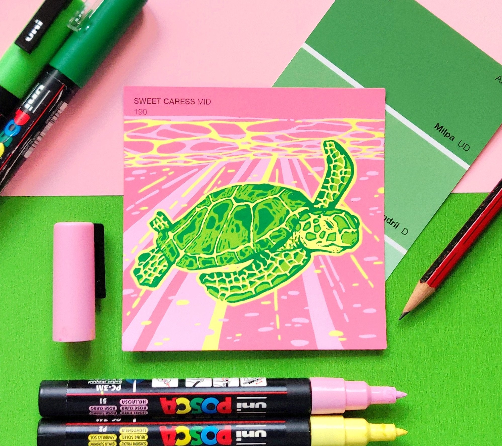 In an effort to find an affordable and eye-catching canvas, I began experimenting with paint pens on paint swatch cards. Due to the pre-determined main colour and small size, it gave me some really interesting parameters to creatively wrestle with.