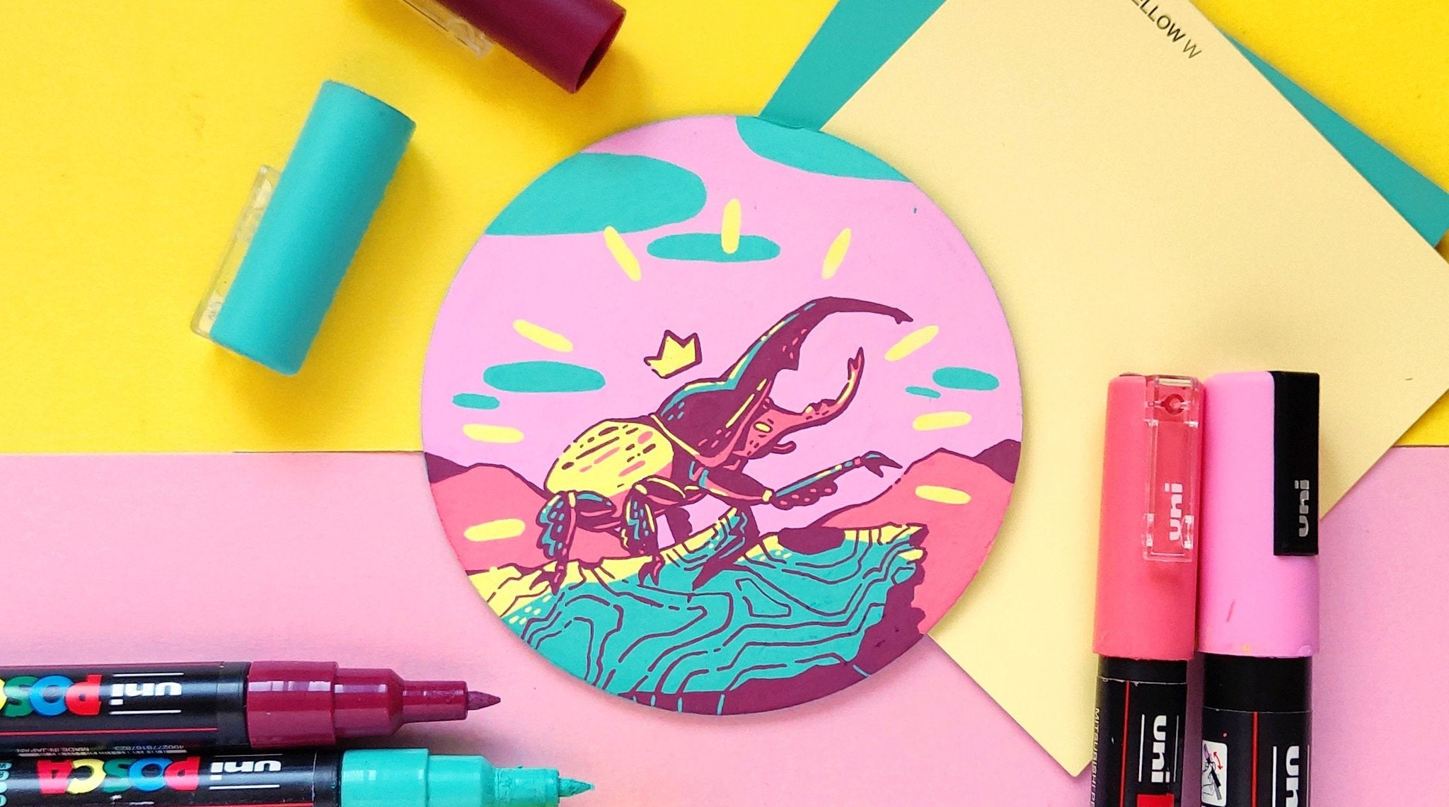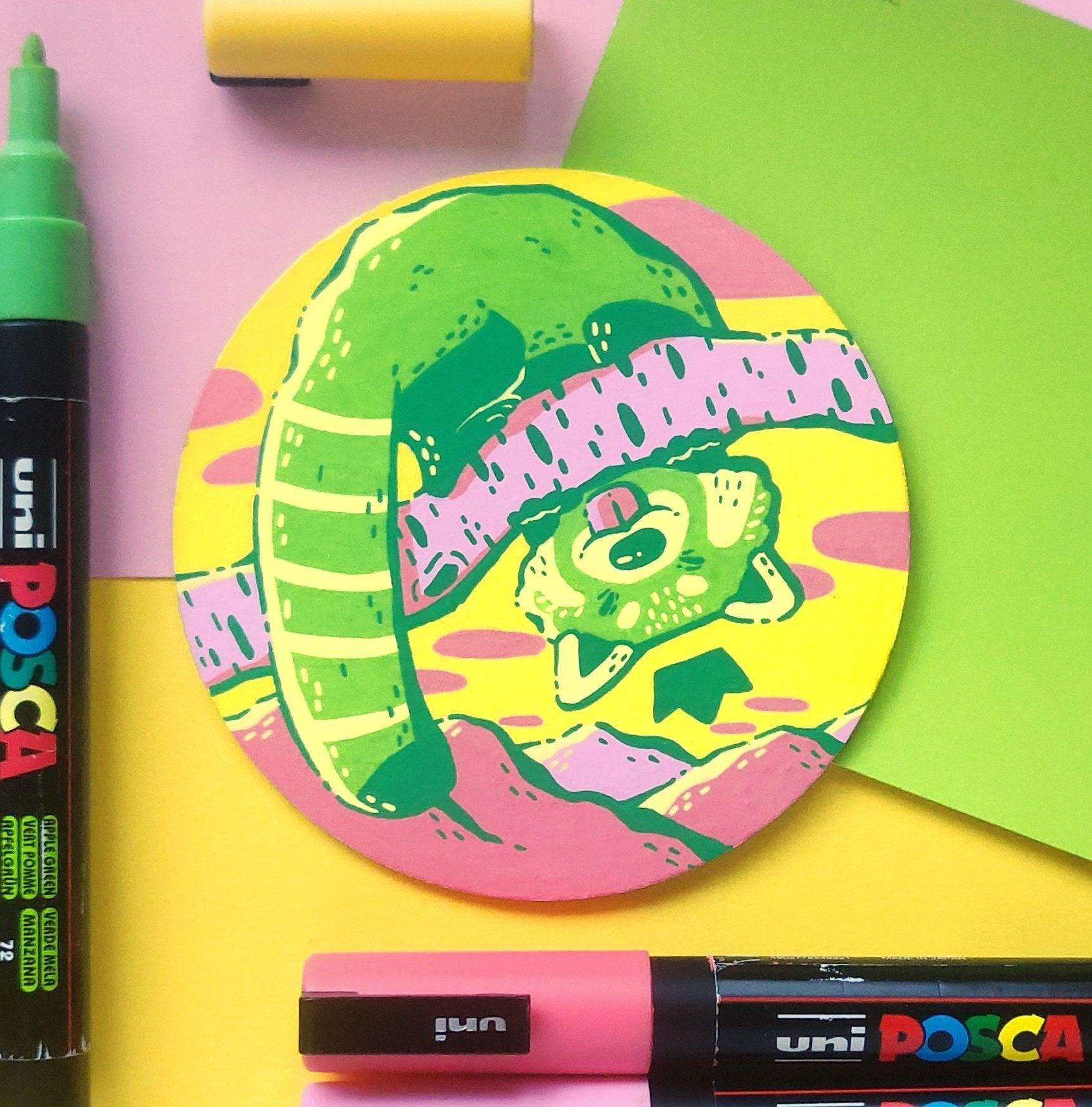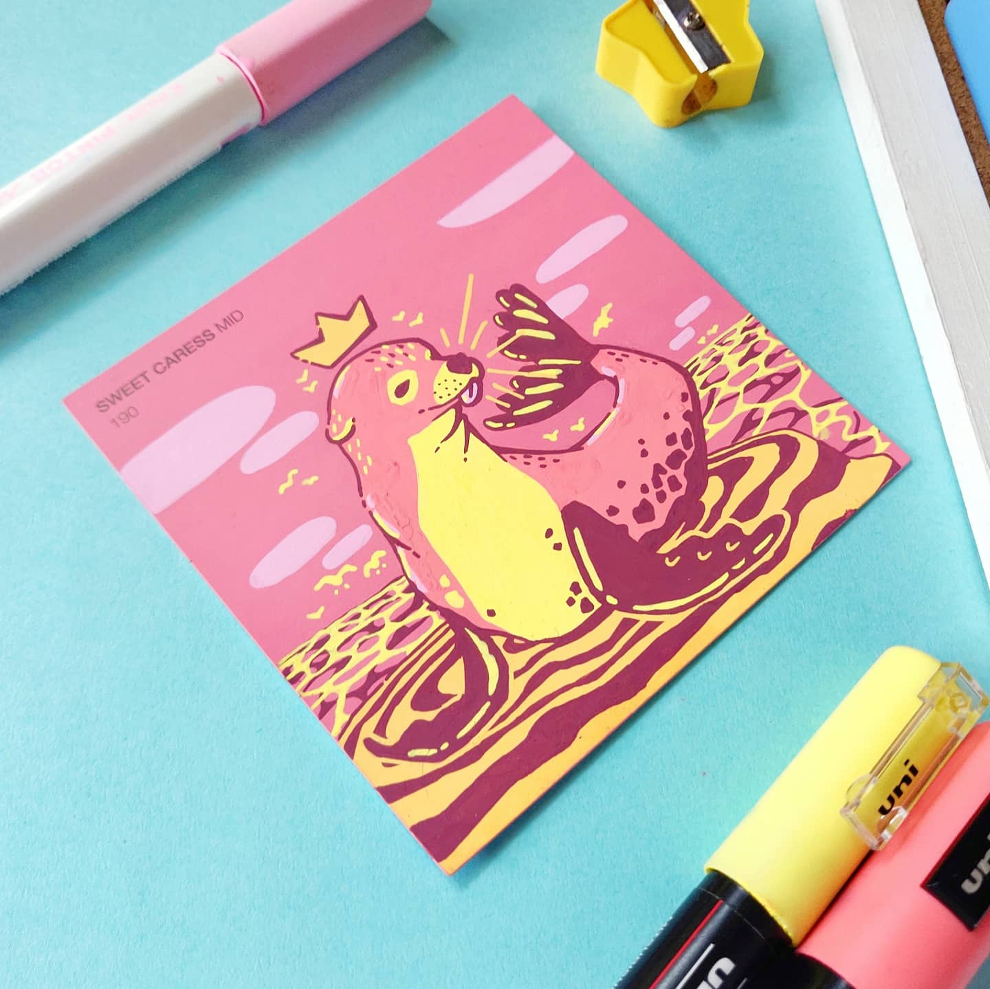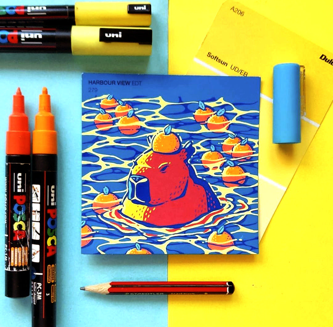In an effort to find more small and accessible surfaces to illustrate on, I turned to these free cardboard coasters I would get in the mail. The different frame shape of these coasters gave a breath of fresh air to paint swatch format when the original squares were getting a bit stale.