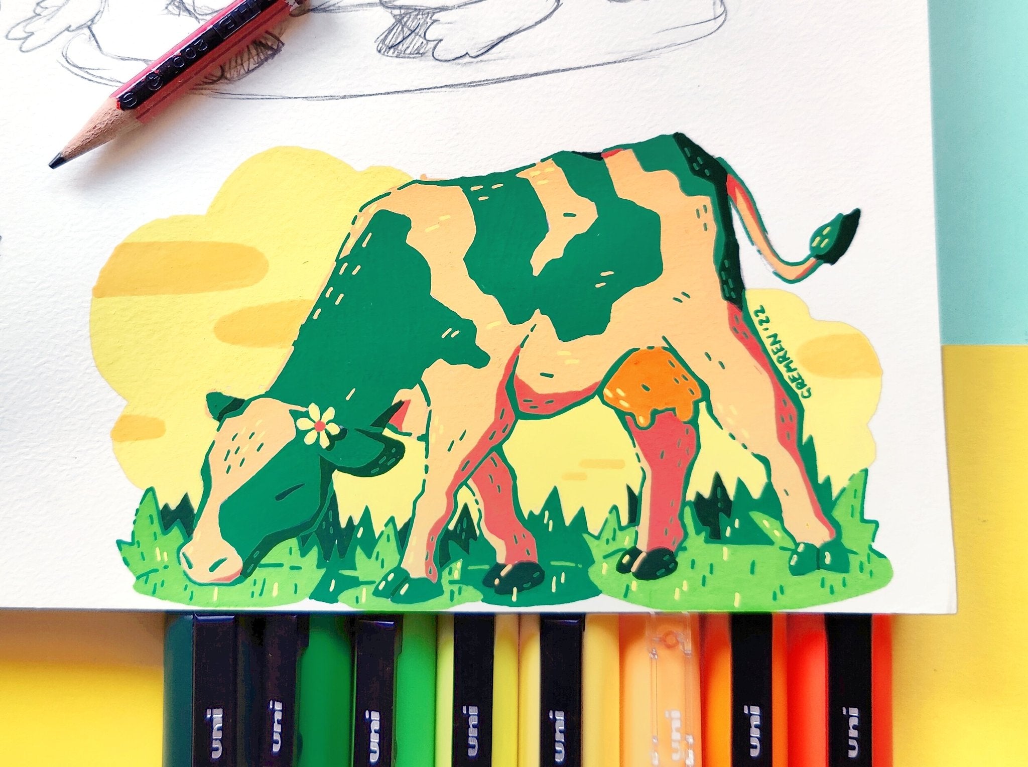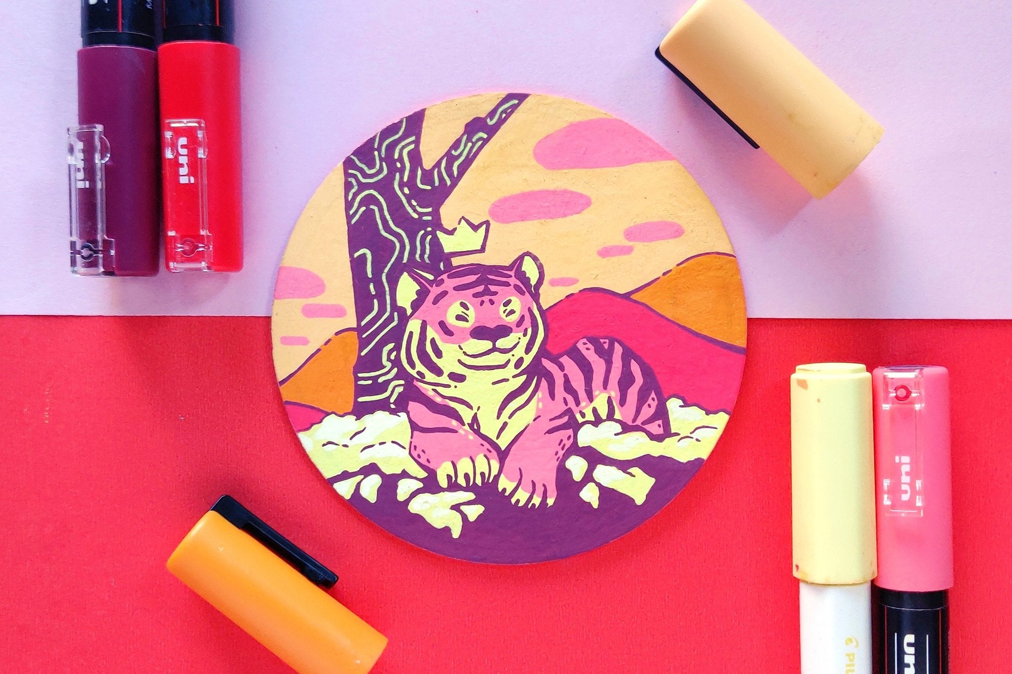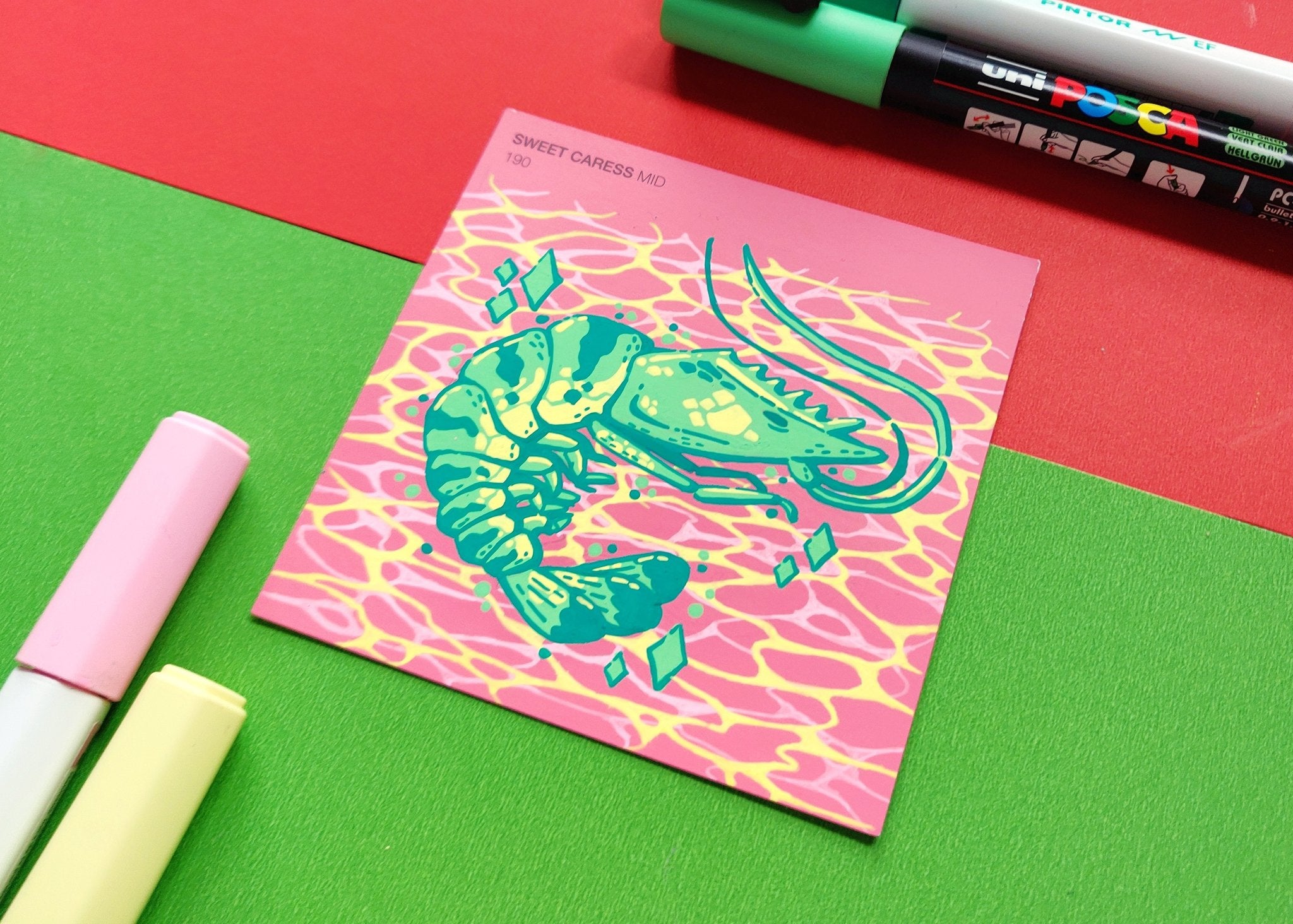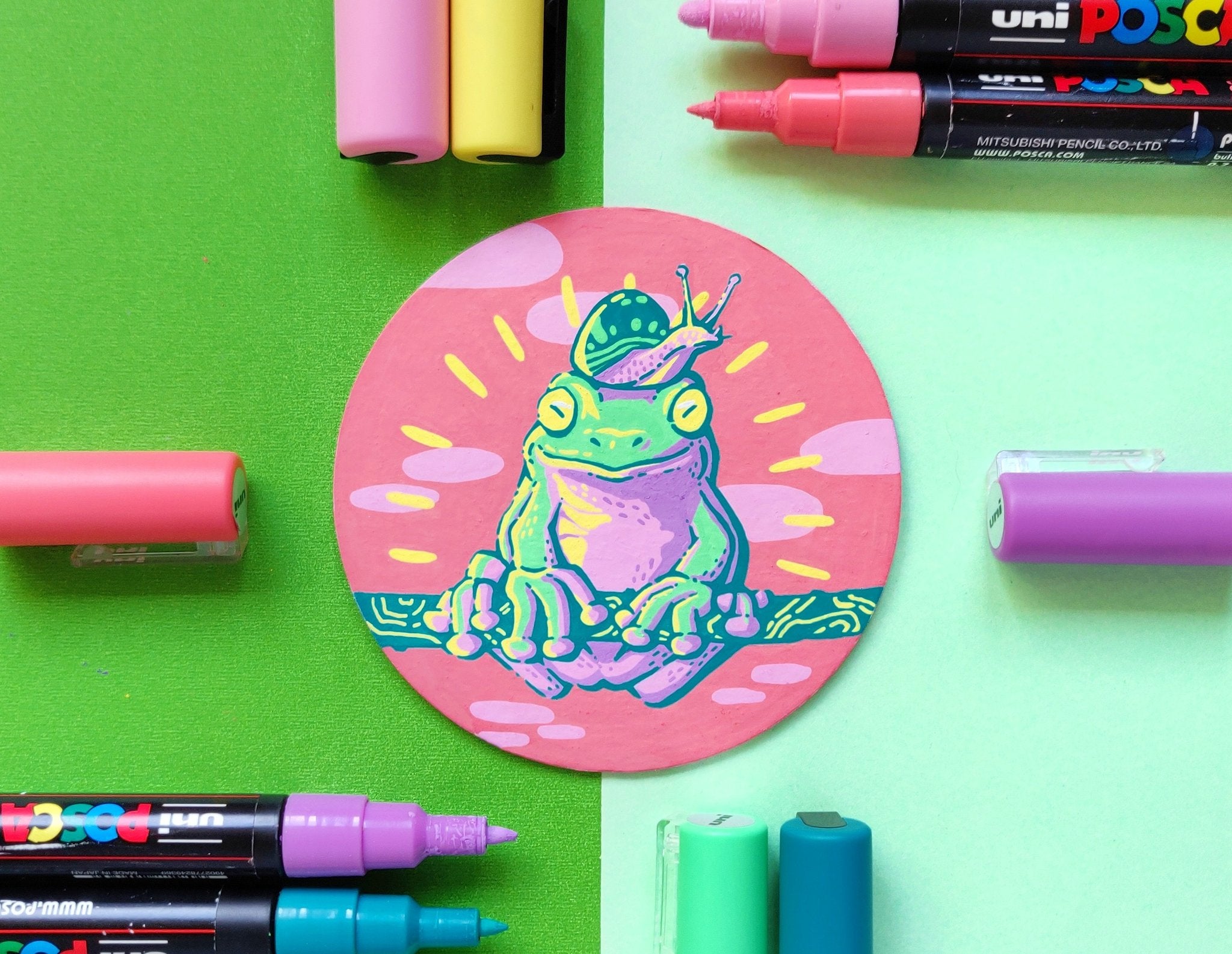 In an effort to find more small and accessible surfaces to illustrate on, I turned to these free cardboard coasters I would get in the mail. The different frame shape of these coasters gave a breath of fresh air to paint swatch format when the original squares were getting a bit stale.