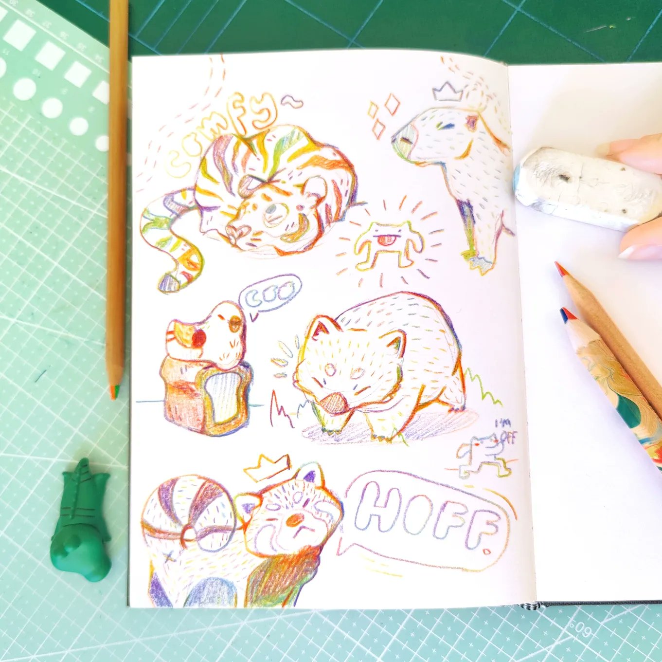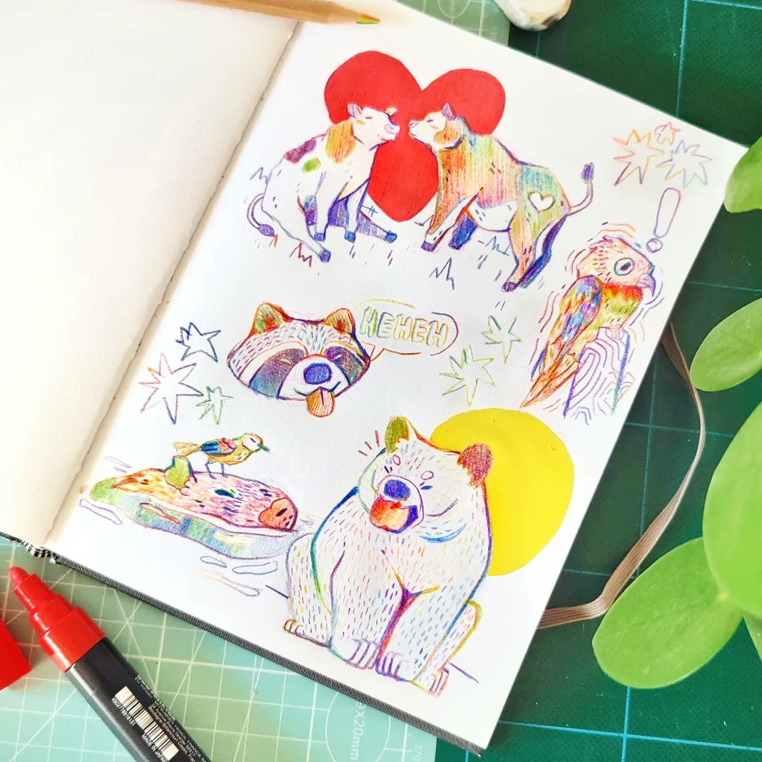 I derive so much joy from taking a creative product traditionally thought of as a children's play thing, and using it in a more serious illustrative capacity. Here I've taken rainbow pencils, a tool traditionally given to kids to doodle with, and created a range of spot illustrations with them. Their vibrancy and unpredictable nature is part of the charm!