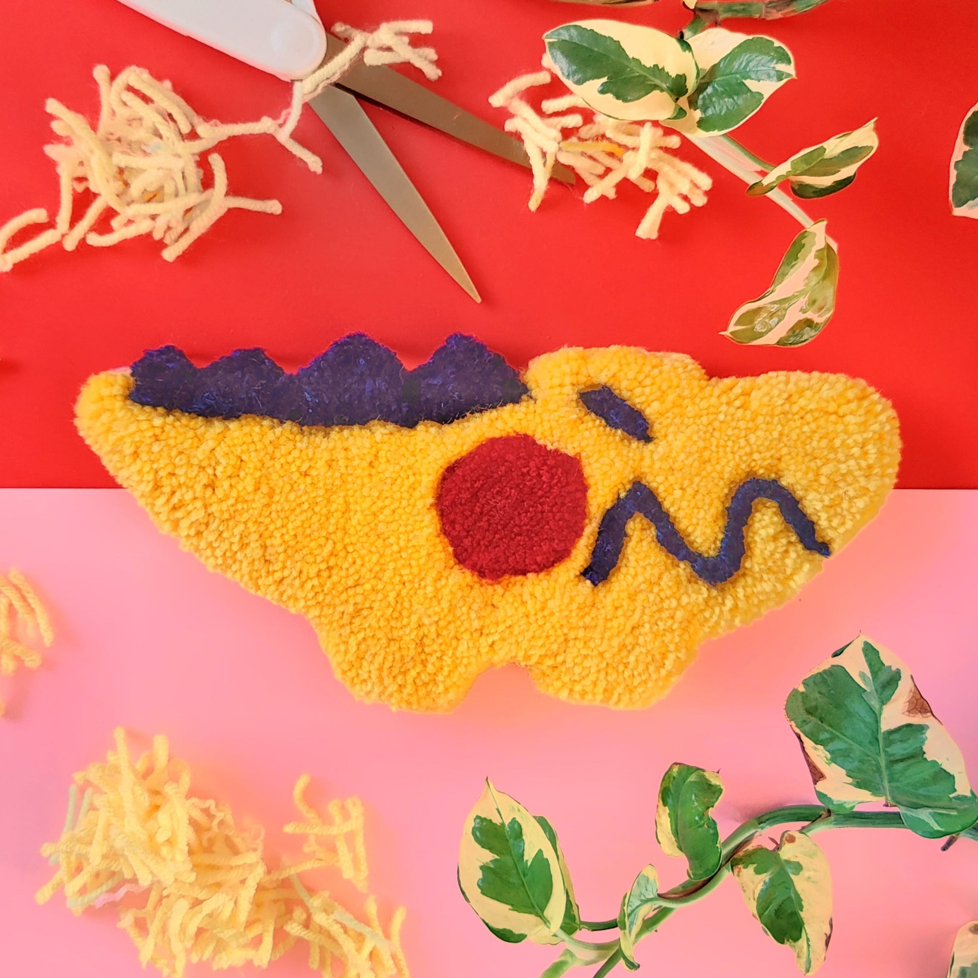 - Made using a rug gun with acrylic yarn, primary rug fabric, and white backing felt