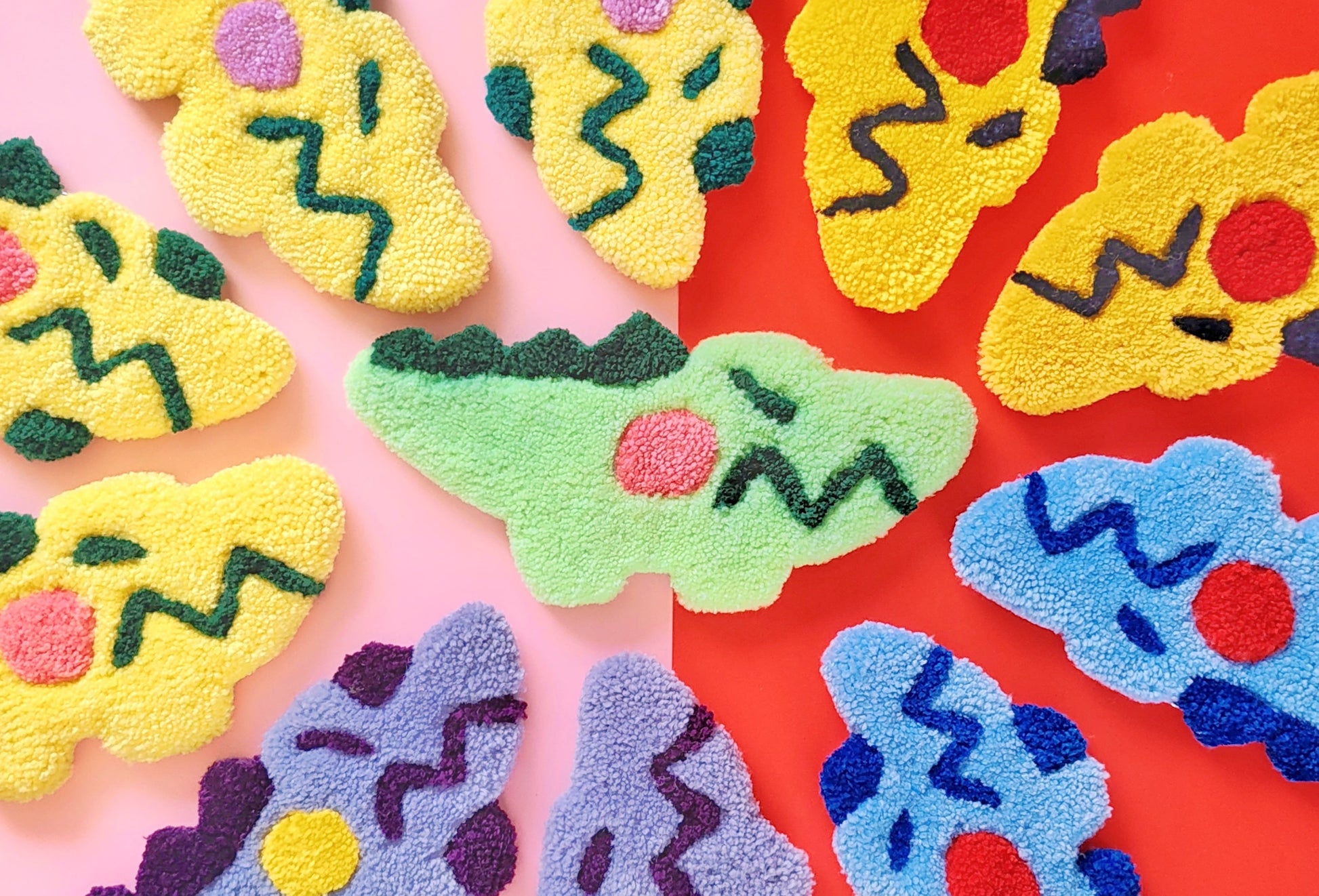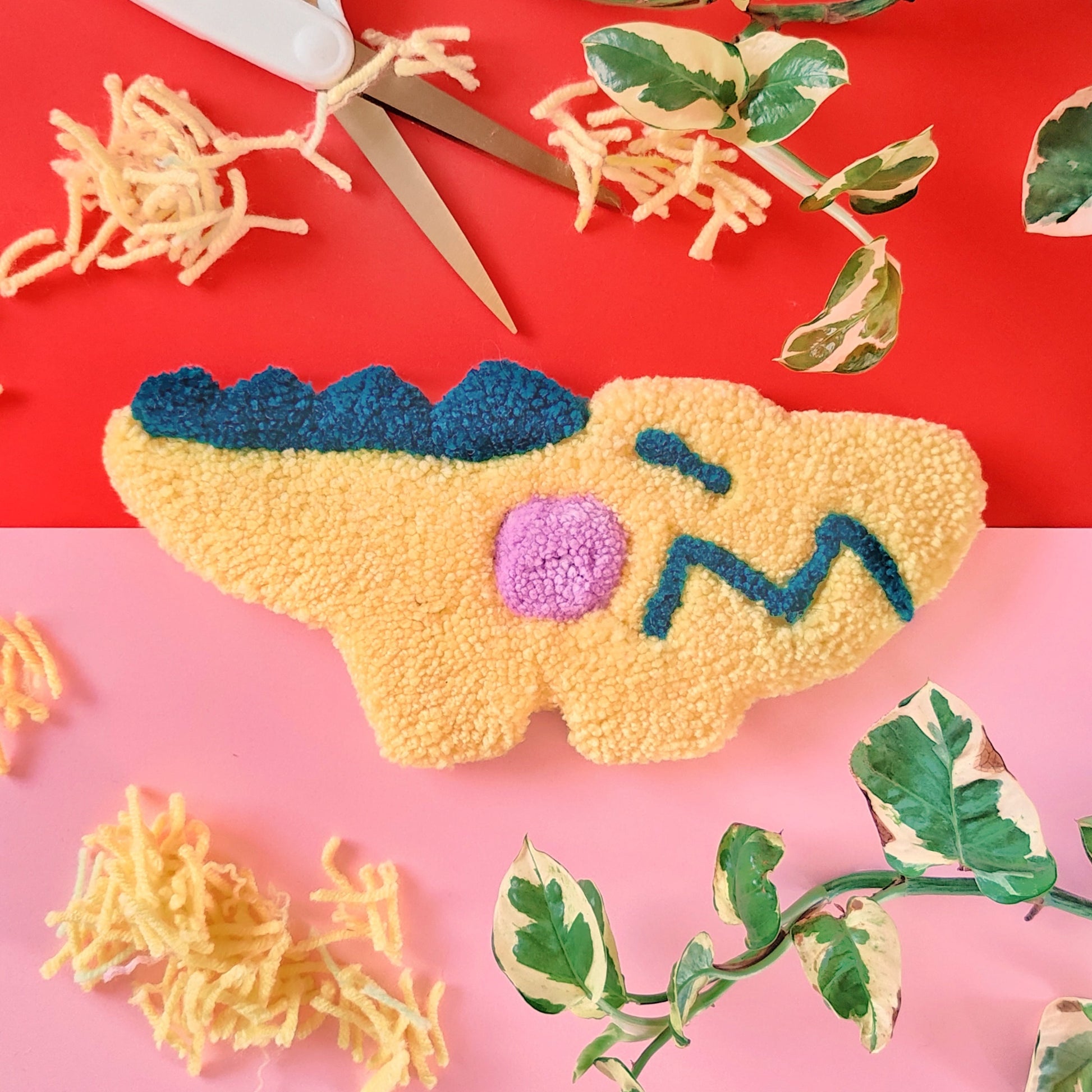 - Made using a rug gun with acrylic yarn, primary rug fabric, and white backing felt